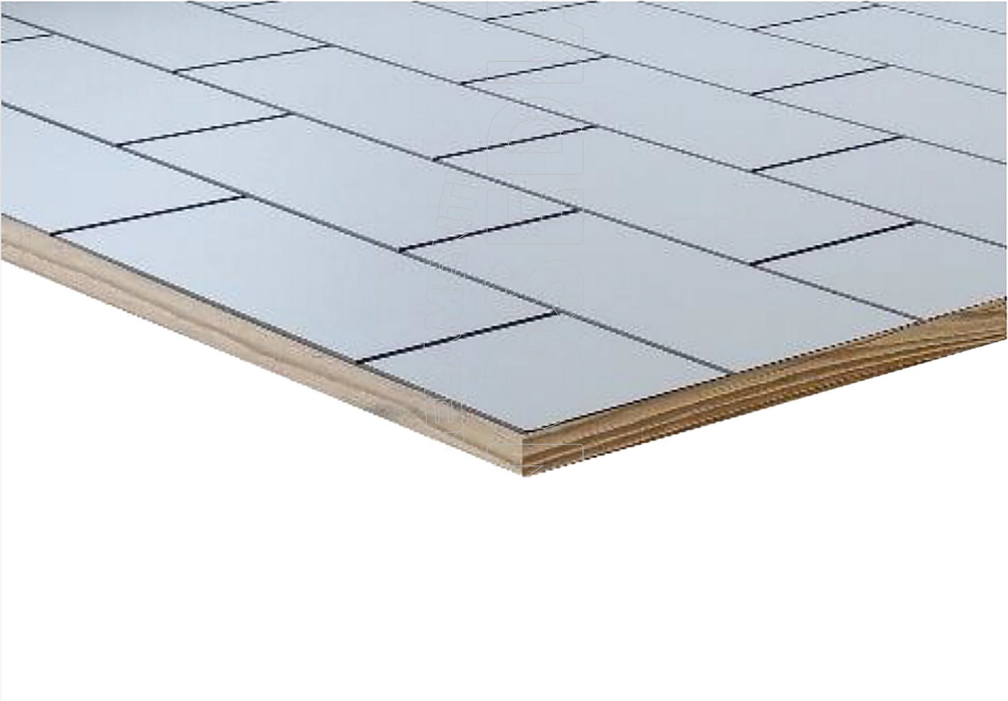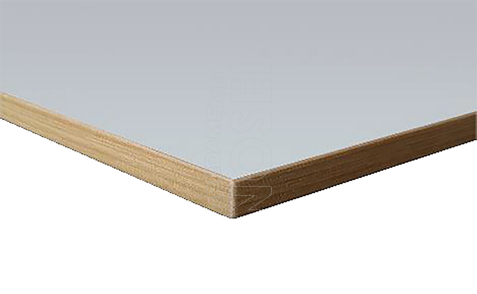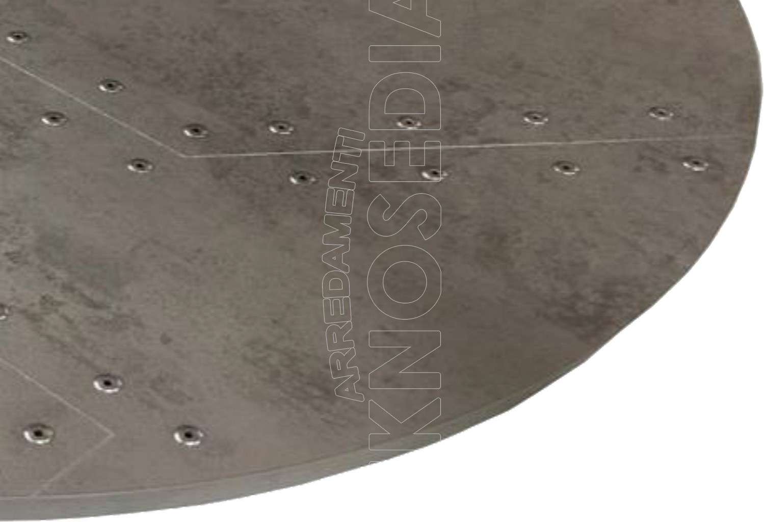 Piano in truciolare E1 a basso contenuto di formaldeide, rivestito in Laminato Decorativo con disegno a tracciatura incisa, e rivetti In alluminio.