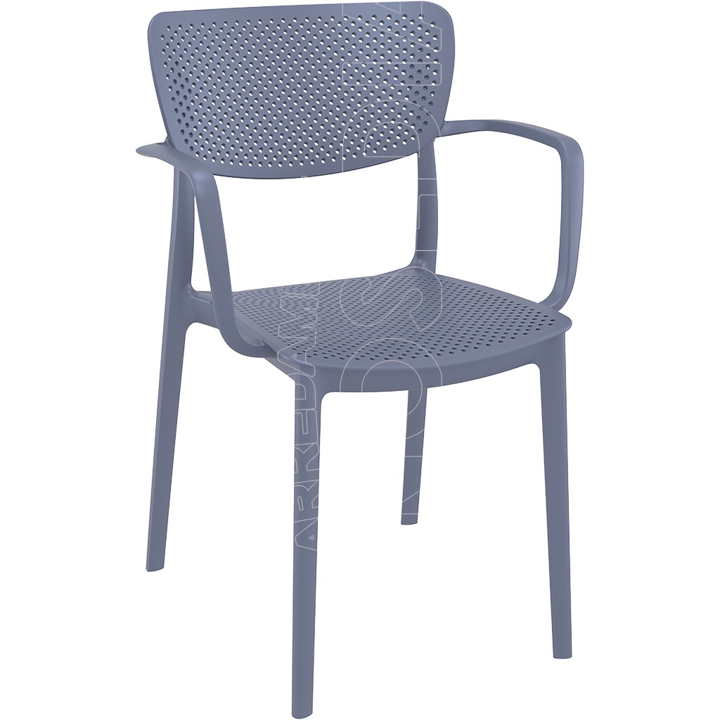 Poltroncina impilabile stampata con l’ultima generazione di iniezione termoplastica air moulding. Seduta in poliproplene rinforzato con fibra di vetro , schienale in policarbonato trasparente. Per uso interno ed esterno.