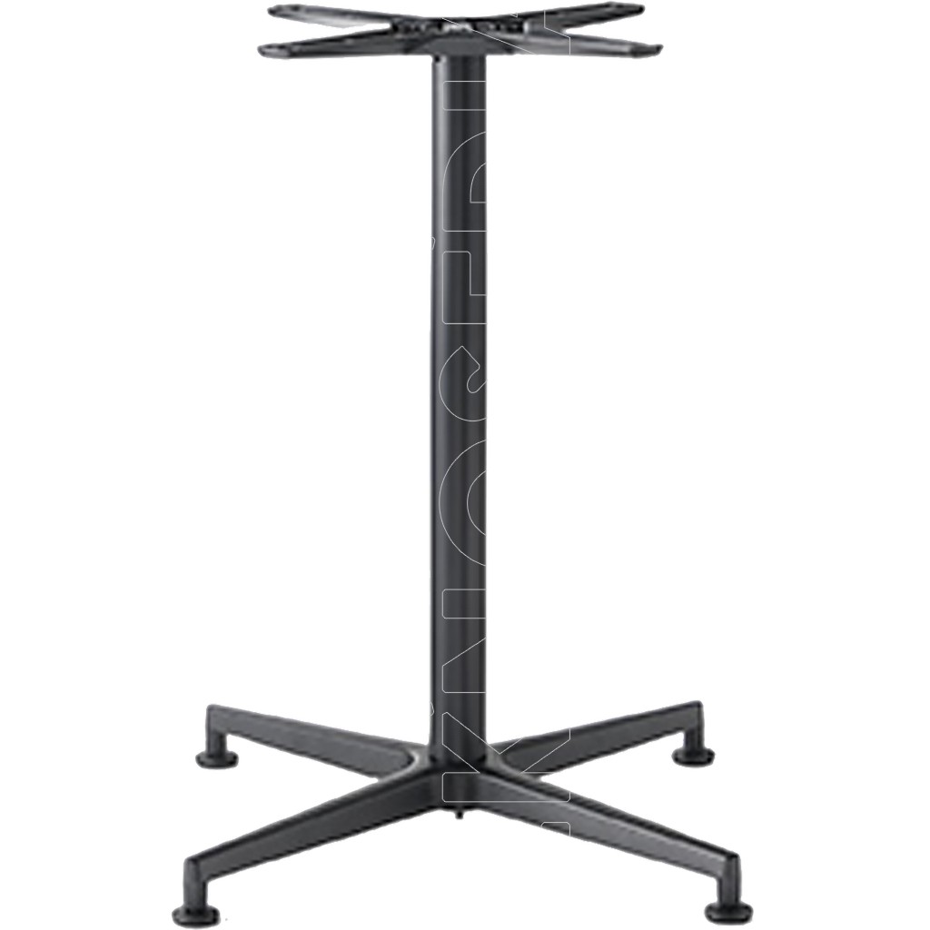 Base a 4 razze realizzata interamente in alluminio cromata o verniciata e crociera sottopiano in alluminio pressofuso. Dotata di meccanismo per ruotare il piano in asse verticale.